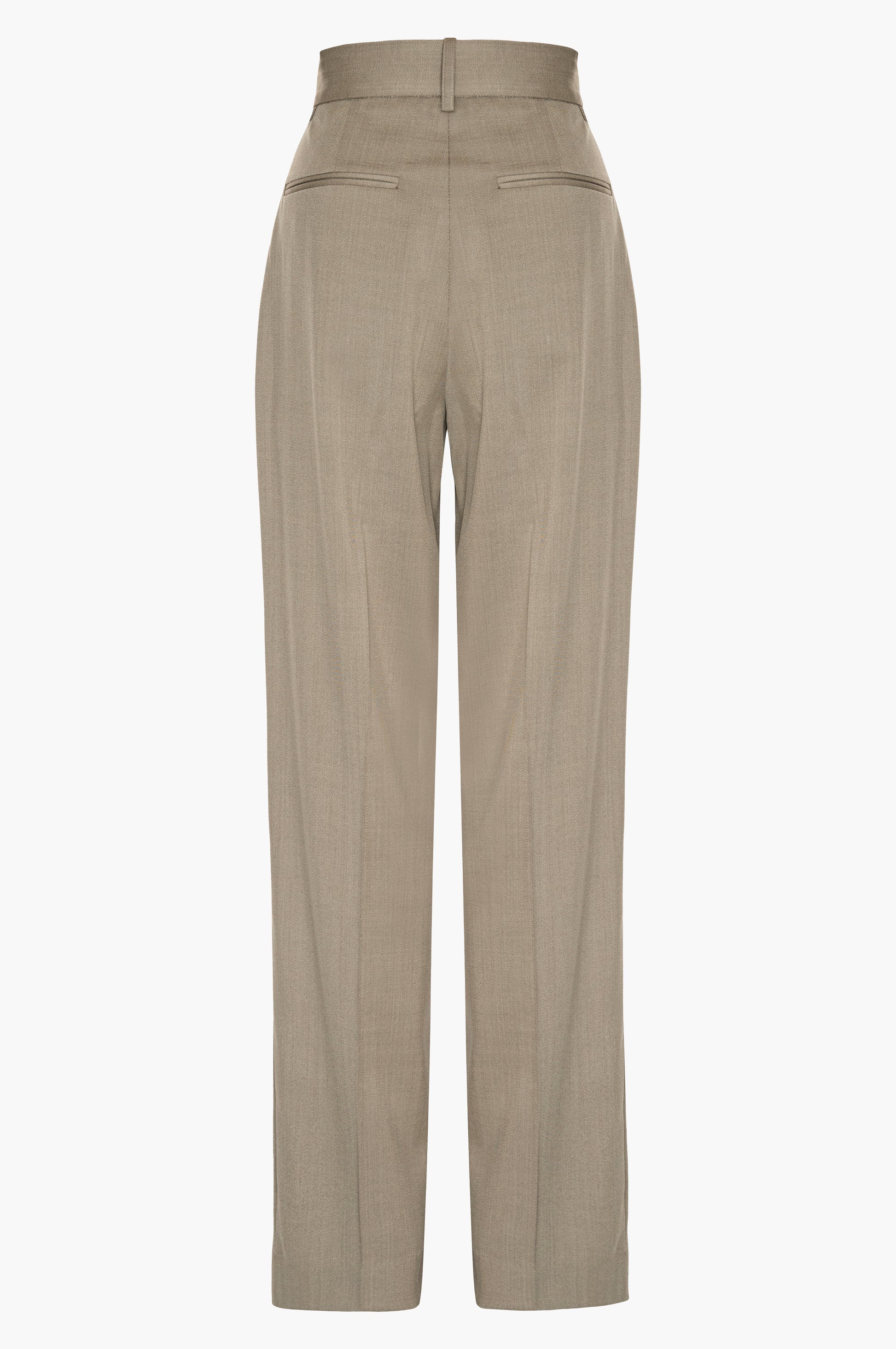 Tailored from pure virgin wool, these high-waisted trousers feature double front pleats and a button-fly closure. The crisp, elongated silhouette is defined by side pockets, back welt pockets, and clean tailored lines.